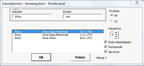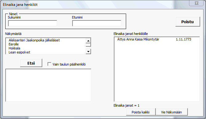 Ylläolevassa esimerkki-leikekuvassa on Elinaika jana työkaluikkuna. Sen avulla voidaan poimia nimen ja/tai Näkymän perusteella Sukutietokantaan ne henkilöt joille tekstiraportin yhteyteen halutaan tulostuvan Elinaika jana kuva.