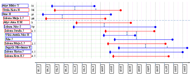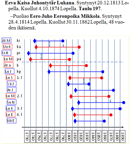 Yllä olevassa tekstiraportin osassa esitetään raportin osana aikajanat muun tekstin jälkeen, jossa on taulun päähenkilö (koetti) ja hänen yläpuolellaan hänen vanhempansa ja ensimmäisen puolison vanhemmat (Esimerkki on kaksipalstaisesta tekstiraportista). Koetin (k) alla puoliso ja lapset puolisoineen. Kaaviosta nähdään havainnollisesti aika-asteikon suhteen elinaika, sekä avioliiton vihkiaika poikittain olevilla nuolilla. Niiden perusteella voidaan esim. nähdä ylläolevasta kaaviosta, että koetin isä (ki) on kuollut ennen koetin vihkiaikaa, äiti (kä) on jäänyt leskeksi, mutta avioitunut uudelleen. Vastaavasti koetin vanhin lapsi (1.l) on jäänyt leskeksi ja avioitunut uudelleen.