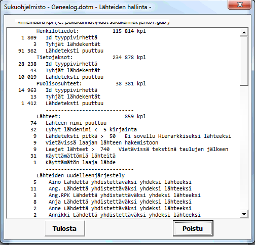 Keskeisin toiminta on lähteiden analysointi. Sen avulla voidaan nopeasti luoda selvyys onko Sukuohjelmisto 2004 -sukutietokannassa kaikki kunnossa lähteiden osalta. Osa virheistä ei johdu yksin tutkijan käytöstä, vaan osa johtuu siitä, että sukukanta voi olla peräisin monesta lähteestä ja sisältää useitakin siirtoja sekä mahdollisia Gedcom-tuonteja. Näin sukutietokanta poikkeaa lähteiden osalta toisistaan ja silloin varsinaisessa tekstiraportissa tulee vaikeuksia johtuen tallettujen tietojen virheellisyydesta ja/tai erilaisuudesta. Alla esimerkki analyysin tuloksesta.