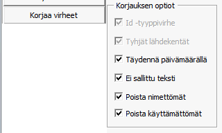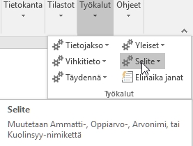 Työkalut-valikon valinnoin voidaan muuttaa ja korjata ja yhdistää keskeisten tietojaksojen Selite-kenttiä.