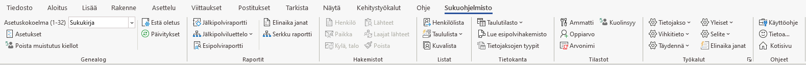 Word 2019 Sukuohjelmisto-valintanauha (kuva yllä). Se jakautuu kahdeksaan ryhmään. Kukin niistä, on ryhmitelty käytönmukaisiin kokonaisuuksiin.
