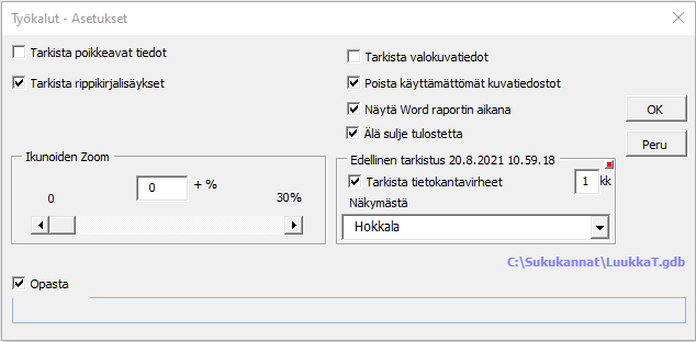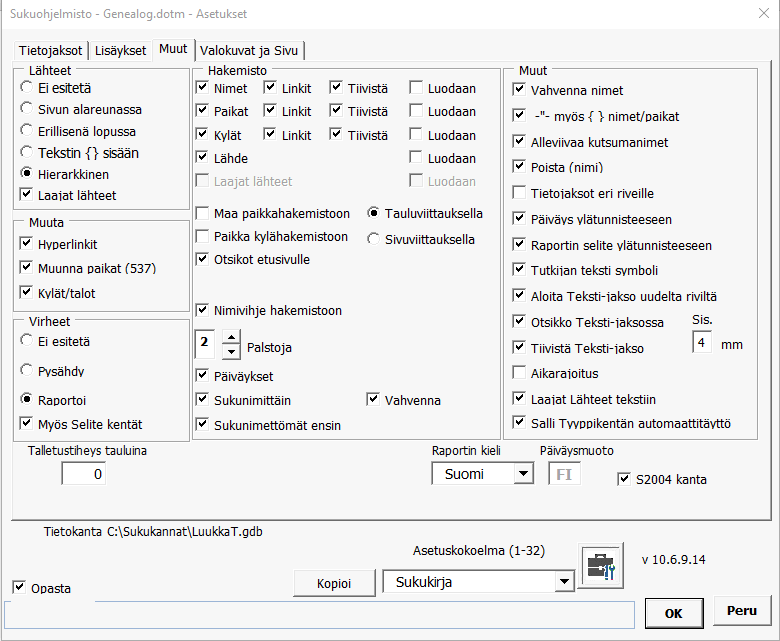 Tässä ikkunassa tehdään Genealog-dotm toiminnalliset asetukset joista osa oli aiemmin muualla valikkorakenteessa. Nyt kaikki on koottu samaan asetusikkunaan. Ikkunassa on myös opastatoiminto joka toimii kuten Genealog-ryhmän Asetukset valinta-ikkunoissakin.