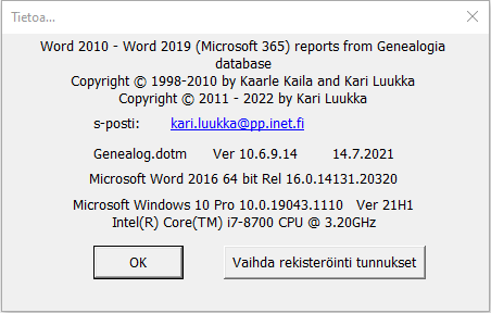Tietoa ikkunassa on nähtävissä perustiedot Genealog.dotm tiedostosta, Word versiosta ja työasemasta. Sieltä voi tarvittaessa käynnistää rekisteröintitunnuksen muutoksen, jos sellaiseen on tarvetta. Tai lähettää sähköpostiohjelmalla laitetiedoilla esitäytetyn sähköpostin minulle jos ongelmia tulee.