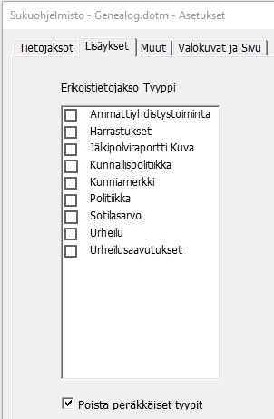 Tähän välilehteen Genealog.dom poimi tutkijan sukukantaan kirjaamat Erikoistietojaksojen Tyyppi-kenttään tallennetut Tyyppitekstit. Näin voidaan poimia Lisäykset-välilehden optiovalintojen avulla raporttiin tulevat Erikoistietojaksot. Tämä uusi ominaisuus laajentaa merkittävästi Erikoistietojakson käyttöaluetta.