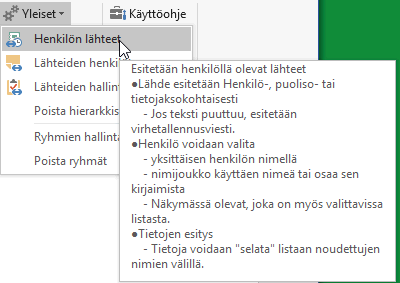 Henkilön lähteet -valinnalla voidaan esittää valitulla henkilöllä olevat lähteet ja nähdä samalla sisältö sekä onko ne muodostetu oikein. Jos on huomauttamista niin korjauskin voidaan tehdä.