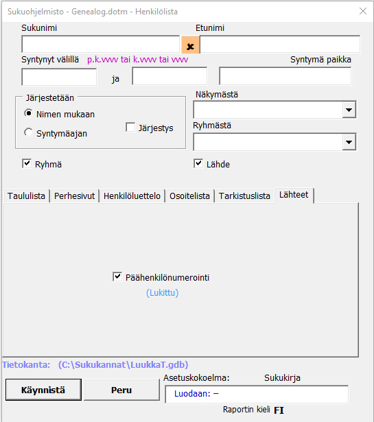 Henkilölistaan on listty uusia ominaisuuksia. Nyt voidaan valita henkilöiden poimintaan myös Ryhmä, Näkymän lisäksi. Samoin henkilöille tallennetut lähteet on mahdollista esittää taulukossa valitsemalla Lähteet-välilehti.