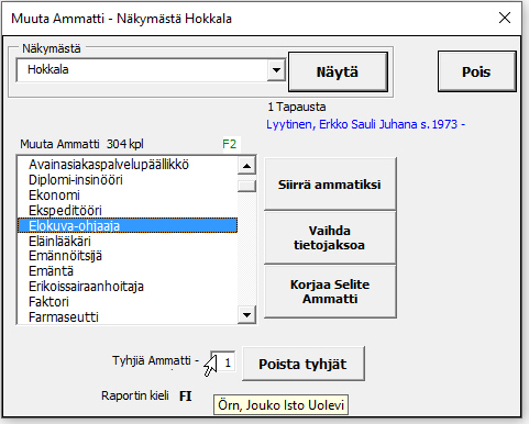 Esim. ammattinimikkeitä voidaan korjata, jos niissä on kirjoitusvirheitä tai jos Ammatti-nimike on kirjattu väärään tietojaksoon, niin voidaan vaihtaa esim. Oppiarvo-jaksoon tai päinvastoin. Samalla nähdään myös jos jollakin henkilöllä on tyhjä tietojakso (kuvassa Ammatti), niiden määrä ja jos vain yksi niin viemällä hiiren kohdistin lukuarvokenttään nähdään myös henkilön nimi (kuvassa Örn,...). Tyhjä tietojakso voidaan poistaa. Valitun nimikkeen lukumäärä, ja jos niitäkin vain yksi, nähdään henkilön nimi (kuvassa Lyytinen,...). Mikäli jollakin tietojaksolla on kielierikoisohjaus, nähdään F2-kentästä mikä nimike on käännetty. Lista esitetään myös raporttikielen mukaisessa aakkosjärjestyksessä. Mikäli listassa nähdään virhe valitussa selitteessä (Ammatti) voidaan nähdä myös kuinka monelle henkilölle se on tallennettu. Virhe voidaan keskitetysti korjata kaikille virheellisen tiedon omaaville avaamatta kutakin henkilöä erikseen Sukuohjelmisto 2400 -ohjelmalla.