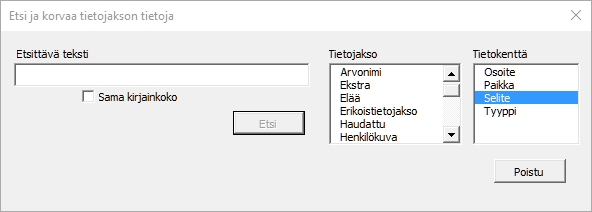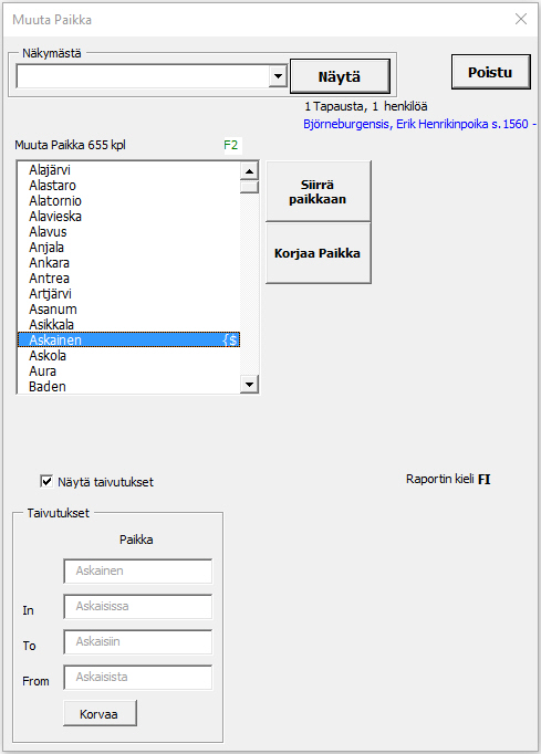 Muuta Paikka valinnalla voidaan korjata paikkanimiä ja tehdä niille myös taivutustiedot. Kielierikoismerkintöjä varten on paikka-listaan lisätty F2 kenttä jossa ilmaistaan millä nimellä on kieliohjus, esim. Suomenkielisellä paikalla on myös valinnainen ruotsinkielinen nimi. Jos raporttikielenä on esim. Svenska esitetään Paikkanimet aakkostaen raporttikielen mukaan. Vastaavasti on valinta kylä - Talo -torppa -tietojen muokkaamiseksi ja niiden taivutustietojen syöttö.